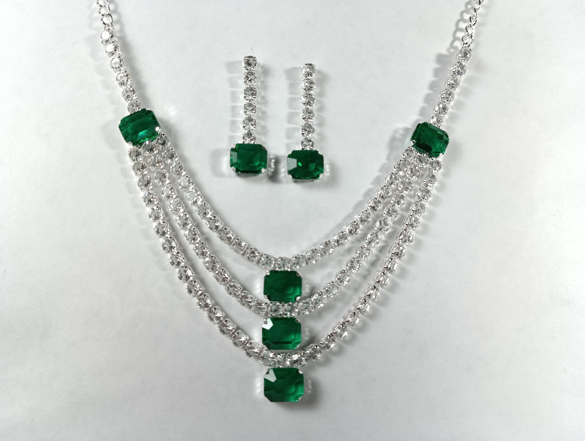 Step into luxury with this emerald green American diamond necklace set, featuring a 3-layered silver-plated design that radiates elegance. Adorned with deep green stones and high-grade cubic zirconia, this jewellery set creates a regal impression perfect for weddings, parties, and festive occasions.